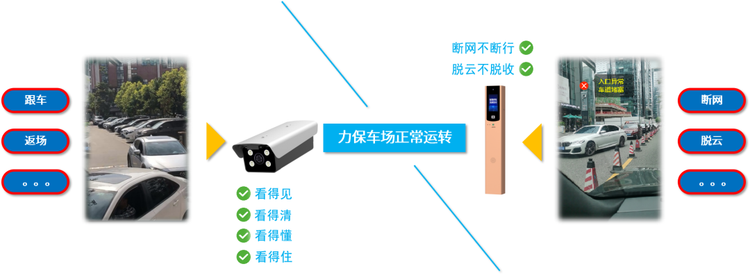 ●断联不停运:断网脱云等紧急情况,前端设备智能接管计费放行,力保车场运转不中断。